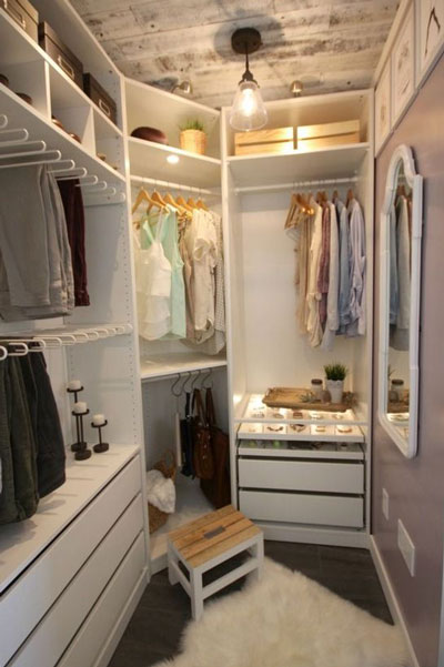 مخصوصا اگر مستاجر هستید این روش خیلی به کار شما می آید. در بخشی از خانه که آن را به عنوان اتاق لباس انتخاب می کنید می توانید قسمت پایین را با قفسه ها و دراورها بپوشانید و در قسمت بالا فضایی برای آویز لباس تعبیه کنید. کنار این بخش می تواند میز توالت و آینه قرار بگیرد تا تکمیل کننده ی اتاق لباس شما باشد.